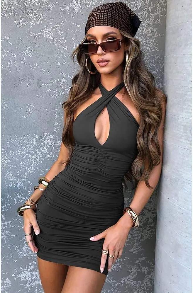 Women's Casual Summer Solid Pattern Mini Dress Sexy Bodycon Cross Ruched Halter Sleeveless Chiffon Natural Waist Plain Dyed